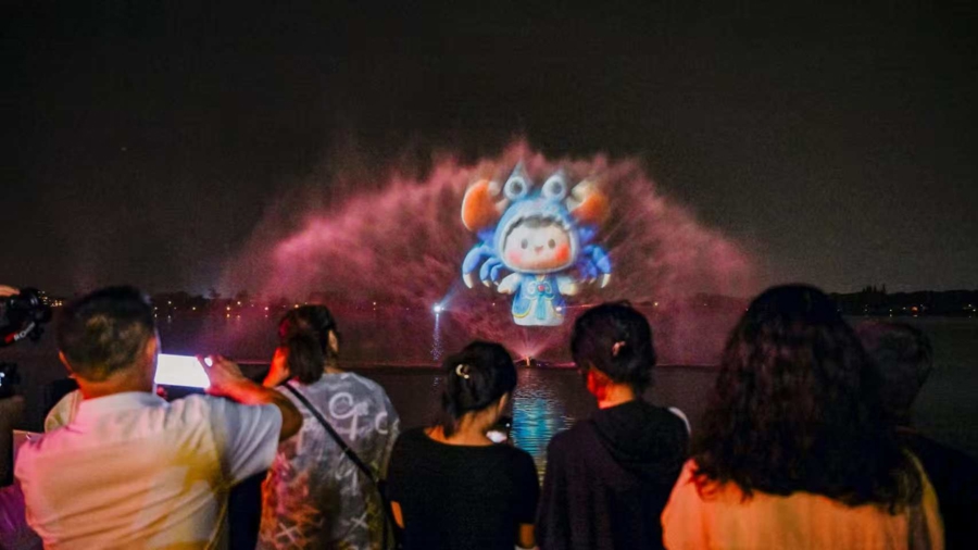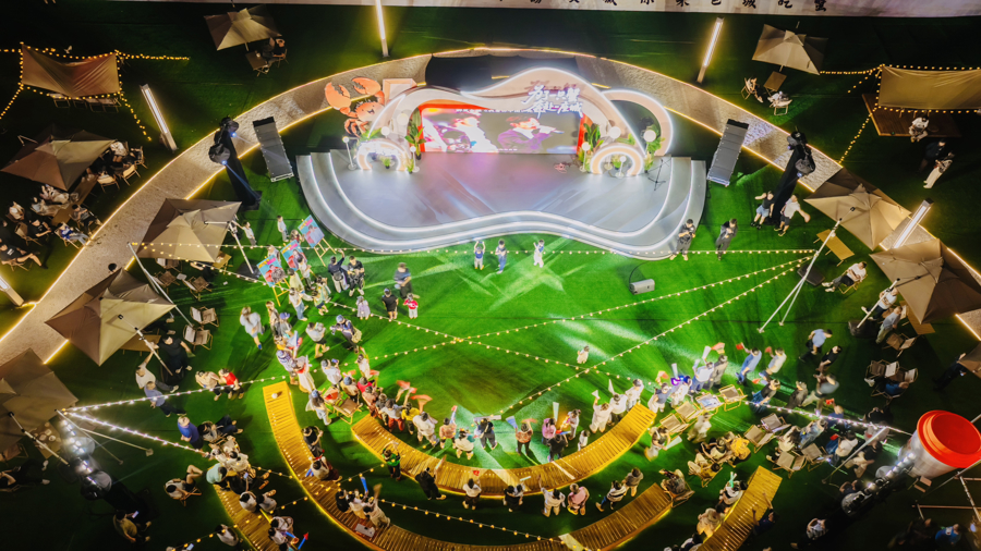 集市开市首日,巴城特色农产品琳琅满目,刚出水的鲜活蟹、网红村咖的醇厚香气与文创手作相映成趣;房车营地与Live音乐结合,营造晚风、音乐与蟹香缠绵的闲适氛围;昆山艺匠的街头表演、小梅花团的昆曲清唱、评弹艺人的弦索叮咚与现代乐队的动感节奏交替上演,在阳澄湖畔碰撞出别样火花。当晚,水幕电影与火树银花在阳澄湖畔相映成趣,交织出一抹庆国庆、迎中秋的动人剪影。湖面上,昆曲小人踏水而来,时而凌波微步,时而转身挥扇,衣袂翩跹间尽显昆曲雅韵。夜幕下,当璀璨烟花骤然绽放,更为这场金秋蟹集增色添彩,引得岸边观众阵阵欢呼。